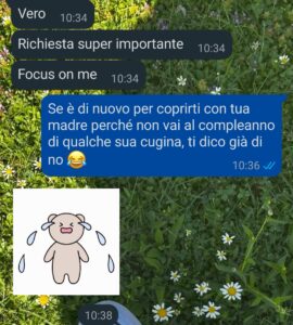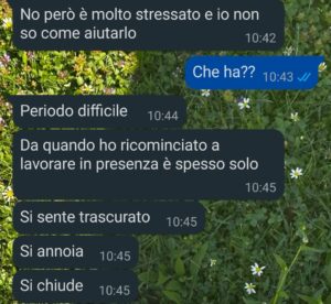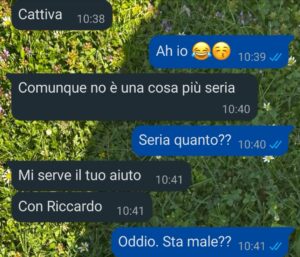 La protagonista di questa chat (oltre a me) si chiama Chiara, un’amica di lunga data, insieme al suo compagno Riccardo. Con lei ci conosciamo da tempo, insieme abbiamo condiviso tanto e le ho anche voluto molto bene. Riccardo, invece, per una fortuita casualità, è un mio ex collega di lavoro. “Ex” perchè quando è successo quello che è successo, l’azienda aveva chiuso e ci aveva lasciati tutti a casa. Un periodo da dimenticare, in tutti i sensi.
