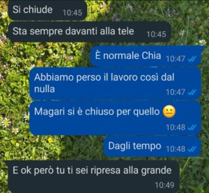 La protagonista di questa chat (oltre a me) si chiama Chiara, un’amica di lunga data, insieme al suo compagno Riccardo. Con lei ci conosciamo da tempo, insieme abbiamo condiviso tanto e le ho anche voluto molto bene. Riccardo, invece, per una fortuita casualità, è un mio ex collega di lavoro. “Ex” perchè quando è successo quello che è successo, l’azienda aveva chiuso e ci aveva lasciati tutti a casa. Un periodo da dimenticare, in tutti i sensi.