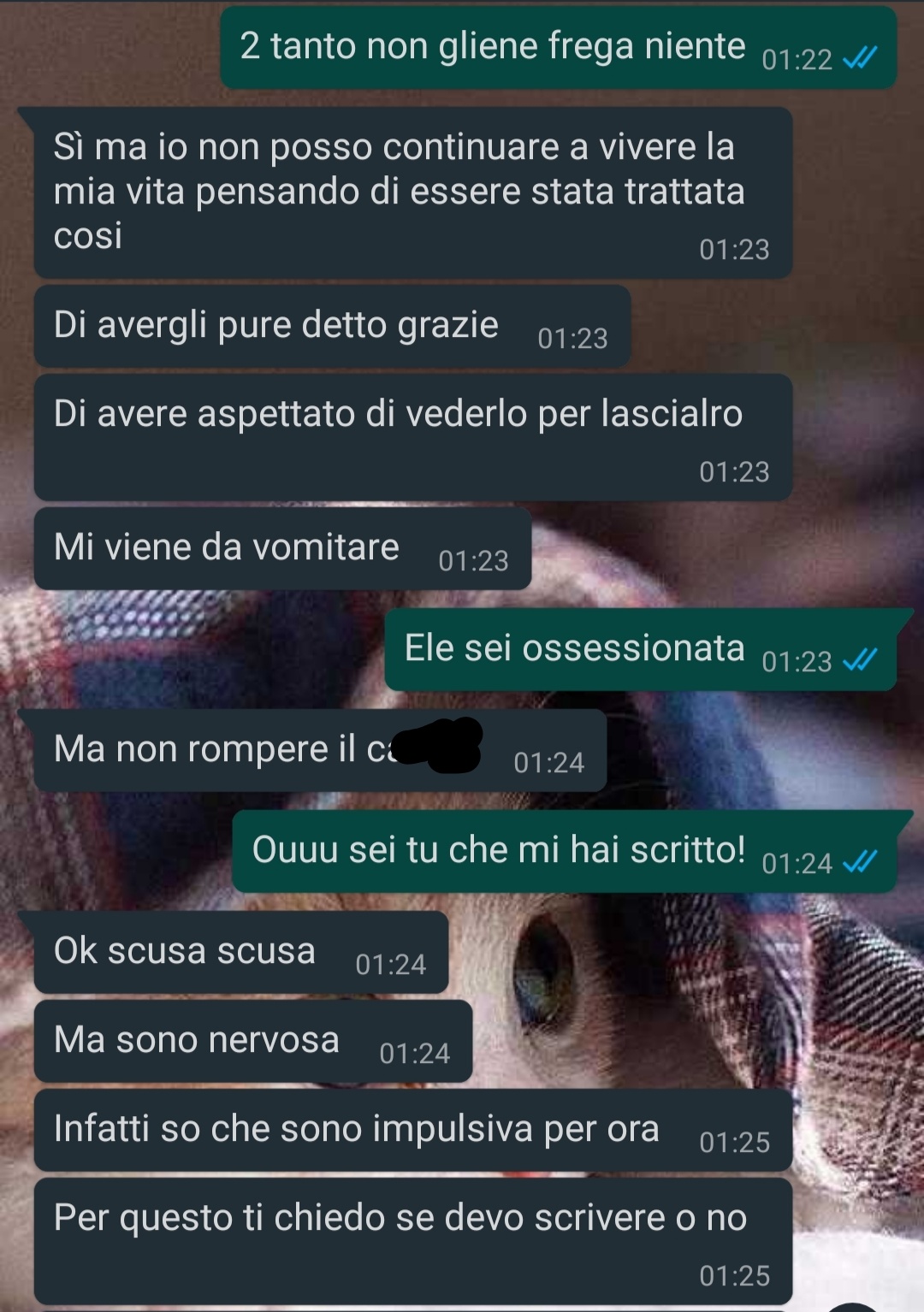 “Ora stiamo cercando di capire qual è il miglior modo di comportarsi, perché davvero lei rischia di rimanere bloccata in questa situazione e in questo rapporto, dato che sono già passate quasi tre settimane da quel giorno e continua a stare così. Sono preoccupata perchè non è da lei: deve scrivergli e continuare questa agonia?”