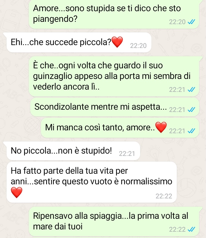 So che ci sono persone là fuori che stanno vivendo lo stesso strazio. A chi ha perso un cane, un compagno di vita, voglio dire che non siete soli. Il dolore che provate è il prezzo dell’amore, e anche se ora sembra insormontabile, un giorno guarderete una foto e sorriderete. Un giorno, forse, troverete il coraggio di aprire il vostro cuore a un altro cane, non per sostituire chi è andato via, ma per onorare il suo ricordo.