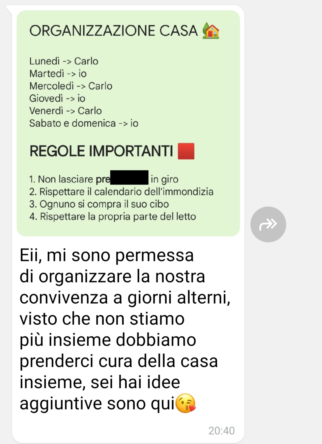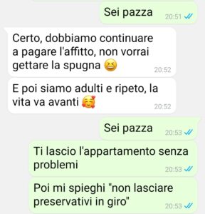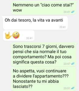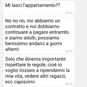 “Ciao, mi chiamo Carlo e da pochissimo tempo sono stato letteralmente scaricato dalla mia fidanzata, con cui abbiamo trascorso diversi anni assieme. Nell’ultimo anno abbiamo anche preso una casa in affitto, per viverci appieno e iniziare la nostra vita da adulti. Dopo avermi lasciato di punto in bianco lei ha deciso delle strane regole per continuare a vivere in casa: insieme. Secondo voi è possibile una convivenza del genere? A me lei manca, e un amore così so che non lo troverò mai più, l’idea di sentire il suo profumo nel suo cuscino ogni notte non è poi così sbagliata..”.