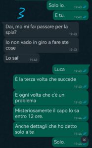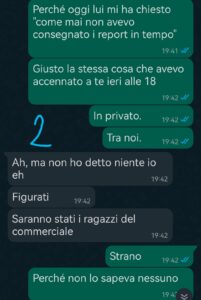 “Non so se è successo anche a voi, ma lavorare con colleghi che ti sorridono in faccia e poi ti pugnalano appena ti giri… è peggio che avere nemici dichiarati. Lavoro in ufficio con Luca da tre anni. Amico, dicevano. Sempre pronto a ridere, aiutarti, offrirti un caffè. Poi ogni volta che qualcosa andava storto, il capo lo sapeva. E lo sapeva SEMPRE prima che potesse saperlo da me. All’inizio pensavo fossero coincidenze. Poi ho scoperto la verità. E gli ho scritto. Questa è la nostra chat. E no, non è finita bene.”