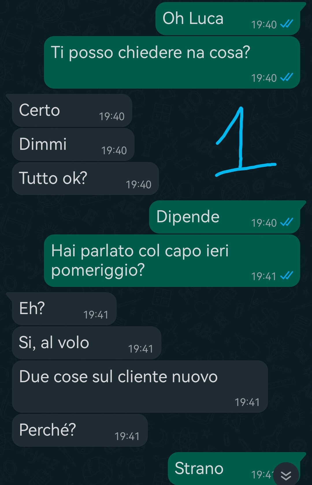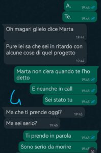 “Non so se è successo anche a voi, ma lavorare con colleghi che ti sorridono in faccia e poi ti pugnalano appena ti giri… è peggio che avere nemici dichiarati. Lavoro in ufficio con Luca da tre anni. Amico, dicevano. Sempre pronto a ridere, aiutarti, offrirti un caffè. Poi ogni volta che qualcosa andava storto, il capo lo sapeva. E lo sapeva SEMPRE prima che potesse saperlo da me. All’inizio pensavo fossero coincidenze. Poi ho scoperto la verità. E gli ho scritto. Questa è la nostra chat. E no, non è finita bene.”