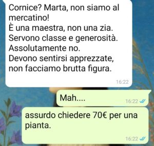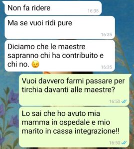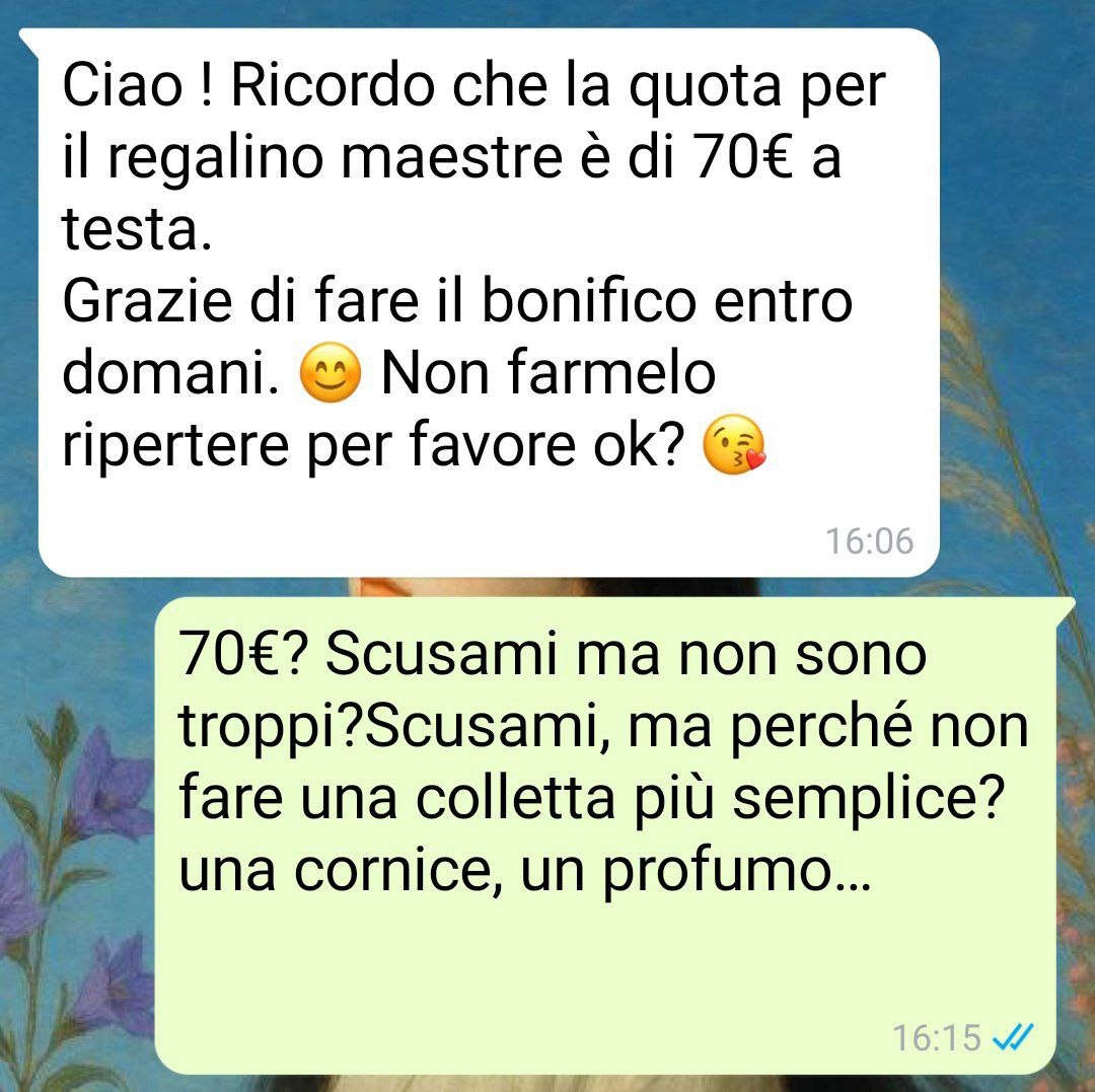 Dopo due messaggi di emoji e buongiorno, scrive: “Quota obbligatoria 70€ a testa per regalo di bentornato alle maestre”.