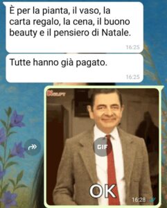 All’inizio penso sia una battuta. Poi vedo “ok, fatto bonifico!”, “va bene tesoro!”, “bonifico inviato!” e resto di sasso.