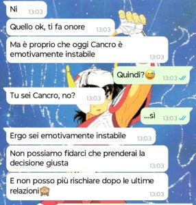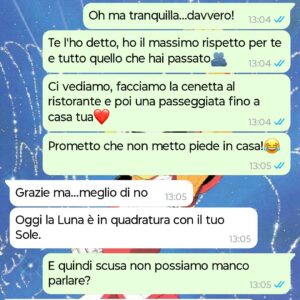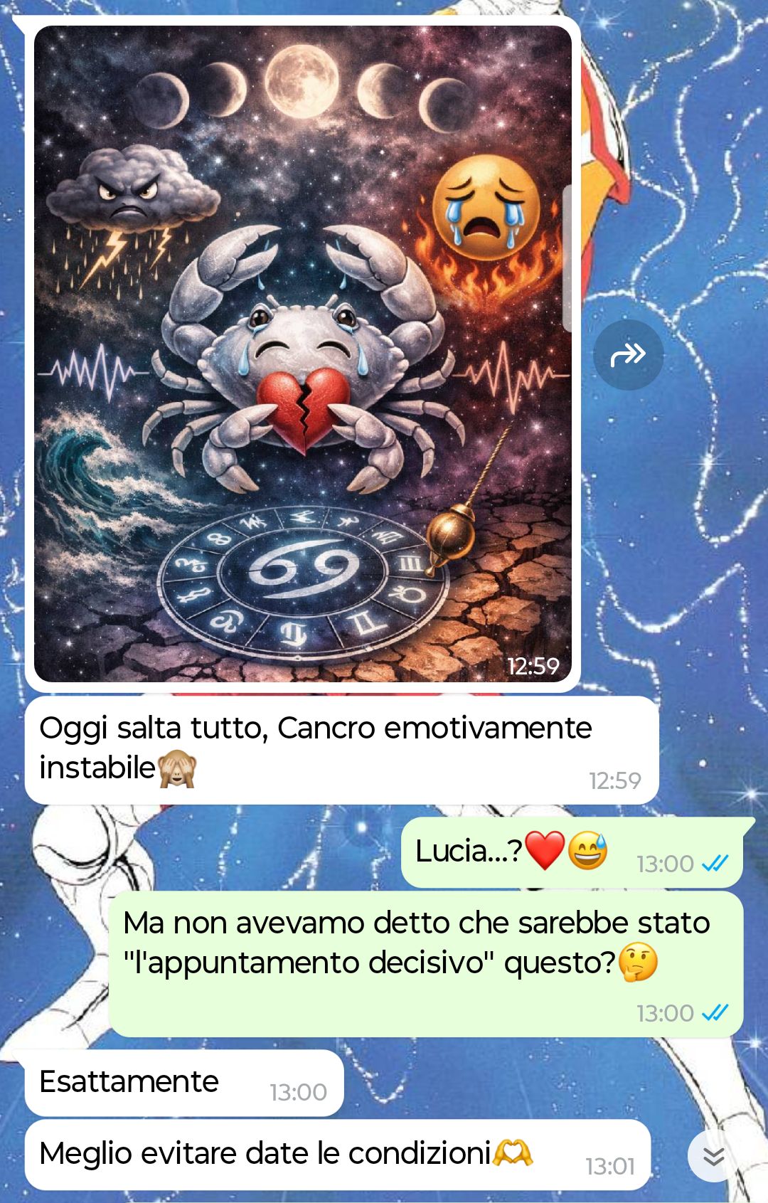 Quando mi ha scritto che non potevamo vederci, pensavo fosse successo qualcosa di serio. Lavoro, famiglia, problemi veri. Invece no. Il problema ero io. O meglio, il mio segno zodiacale. Secondo lei, quel giorno i Cancro erano emotivamente instabili e potevano prendere decisioni sbagliate. Non solo con lei, ma in generale. Per questo non voleva vedermi. E non voleva nemmeno che uscissi con i miei amici, perché avrei potuto farmi trascinare “dall’energia sbagliata” e finire tra le braccia di qualche Scorpione.