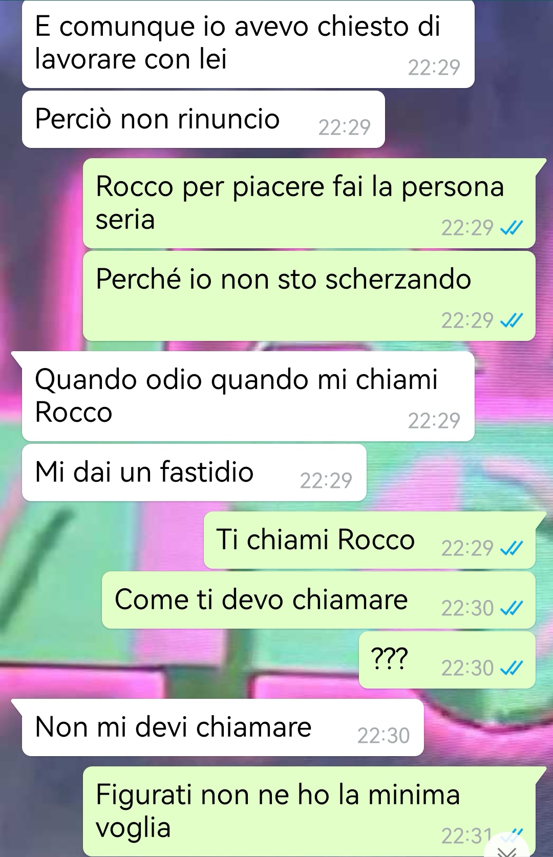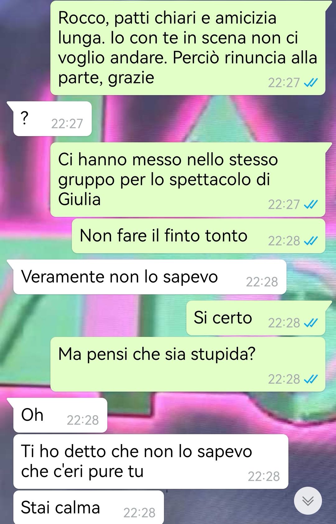 Il secondo dopo me ne sono pentita tantissimo, mi sono sentita uno schifo e ho confessato tutto a Rocco, il mio ragazzo. Lui, sconvolto, mi ha lasciato. Io e Rocco frequentiamo la stessa scuola di teatro e guarda caso dopo un mese dalla nostra rottura ci hanno messo nello stesso gruppo di attori.