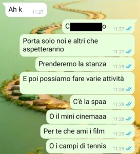 “Ciao, mi chiamo Giada e sarei fidanzata con Daniele. Peccato che non ci parliamo più dopo i discorsi orrendi che mi ha fatto. Io e lui stiamo insieme da un anno e mezzo, ci siamo conosciuti attraverso amicizie in comune e lui ci ha provato sin da subito con me e io ho capito che era quello giusto. Sinceramente avrei voluto scoprire molto prima che mi sbagliavo e anche di grosso. Quello che dovete sapere è che io sono una molto organizzata, preparo di tutto quando c’è qualcosa che mi appassiona, ma soprattutto so che lui vuole sempre lavarsene le mani. Lui è il classico ragazzo che lascia fare a me, non perché io non voglia lasciargli spazio decisionale, ma perché lui vuole essere trasportato qua e la senza preoccuparsi di nulla. Ed ecco che io ho organizzato nei minimi dettagli il nostro san valentino in un agriturismo con spa e altre cosine belline fatte appositamente per il periodo degli innamorati. Ma nel momento in cui gli spiego la situazione, lui sgancia la bomba che distruggerà la nostra relazione.”