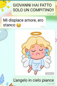 ma sul diario sapete cosa si scrivono anche? ditelo insieme a me, si scrivono i compitini. molto importanti. Io lo so che un angelo in cielo sta piancendo Perché qualche monello non fa i suoi compitini. ma bisogna che quel braccio meccanico arrivi fino al cielo lungo lungo lungo con la sua rugiada e peschi il mio angelo dal celo. Cicogna ti aspettiamooo”