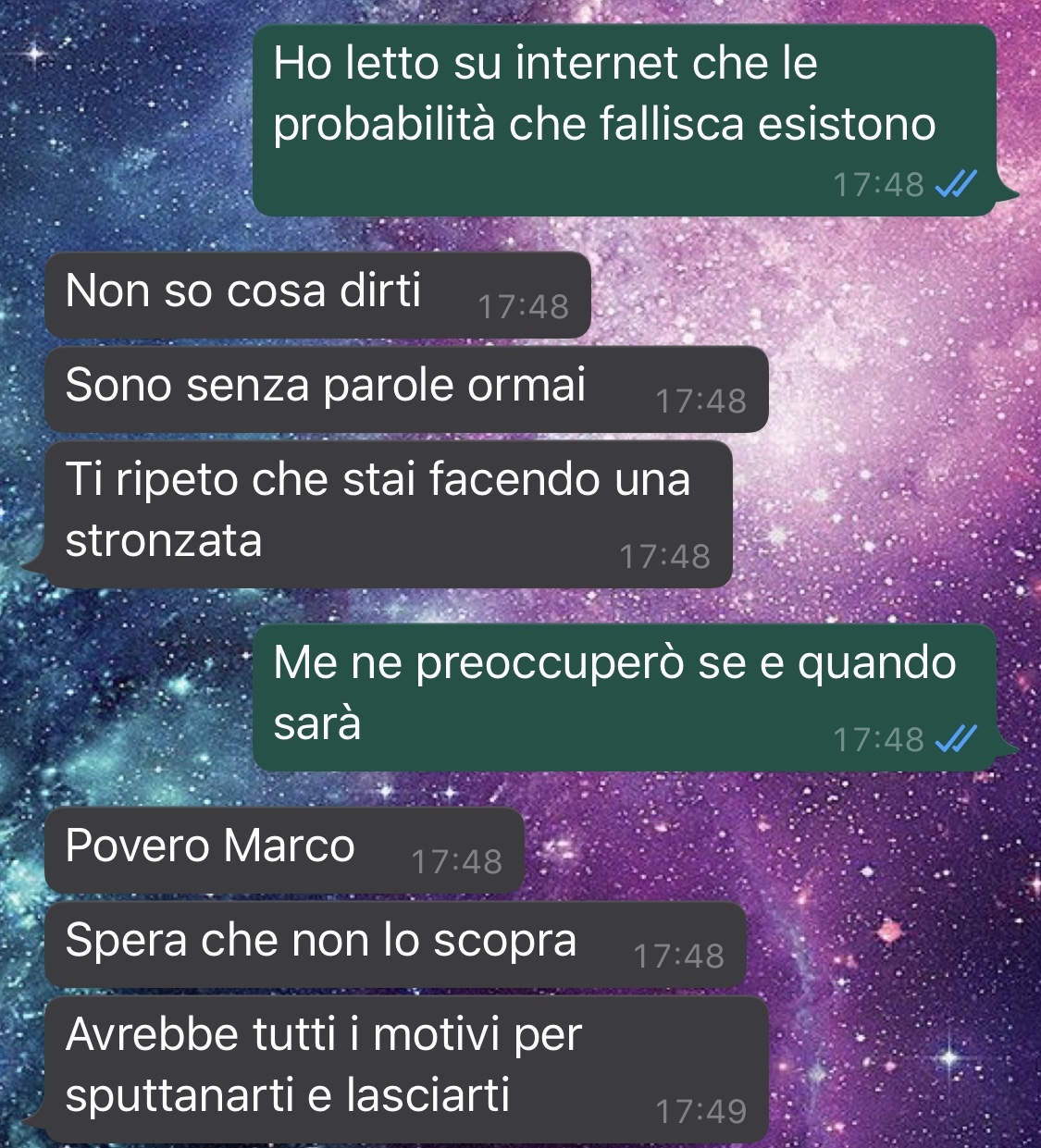Ho fatto gli screen e li ho inviati al mio cellulare, così da potermi difendere nel caso in cui non avesse voluto abortire e cercasse di portarmi in tribunale per obbligarmi a riconoscerlo ed a corrispondere il mantenimento.