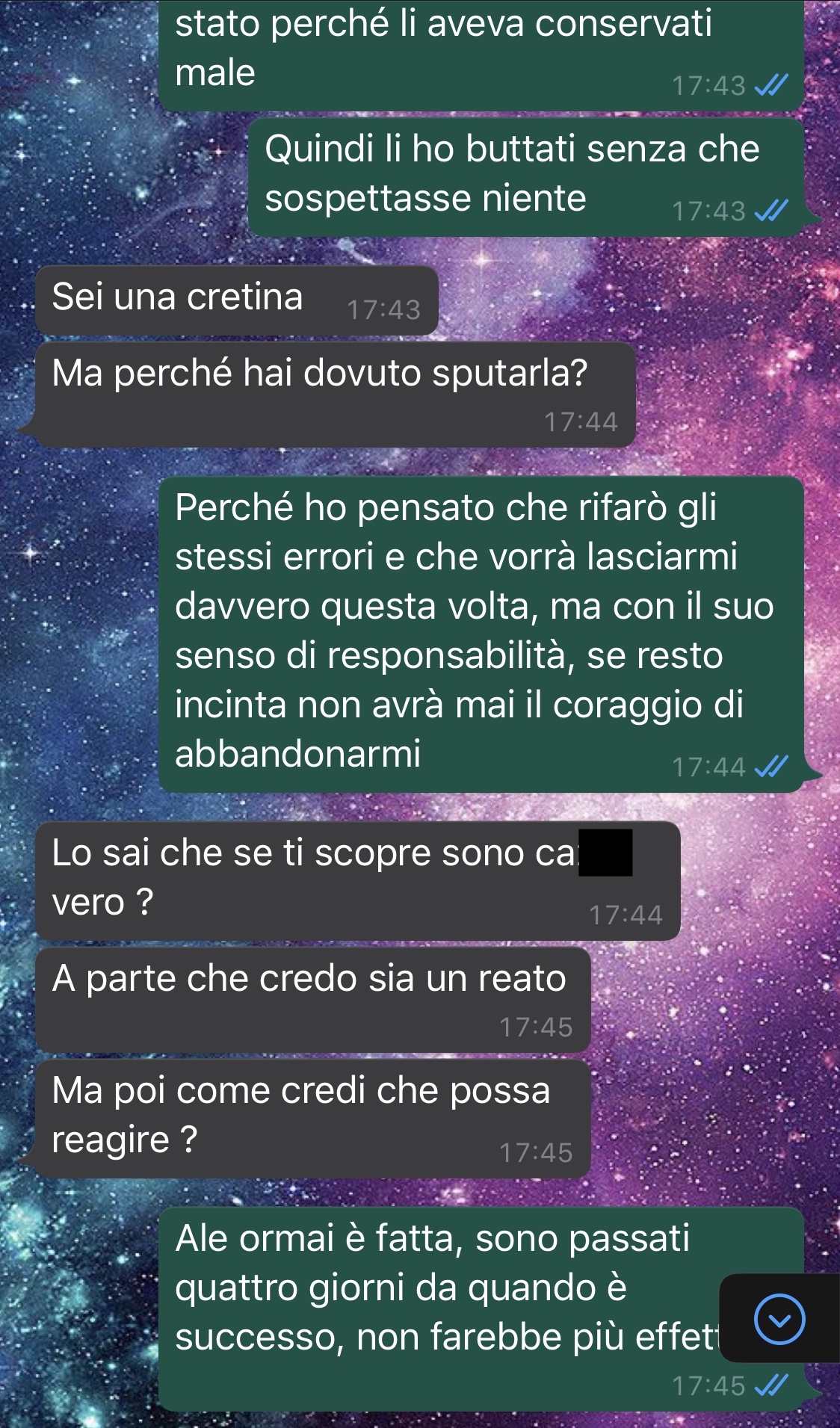 Ho fatto gli screen e li ho inviati al mio cellulare, così da potermi difendere nel caso in cui non avesse voluto abortire e cercasse di portarmi in tribunale per obbligarmi a riconoscerlo ed a corrispondere il mantenimento.