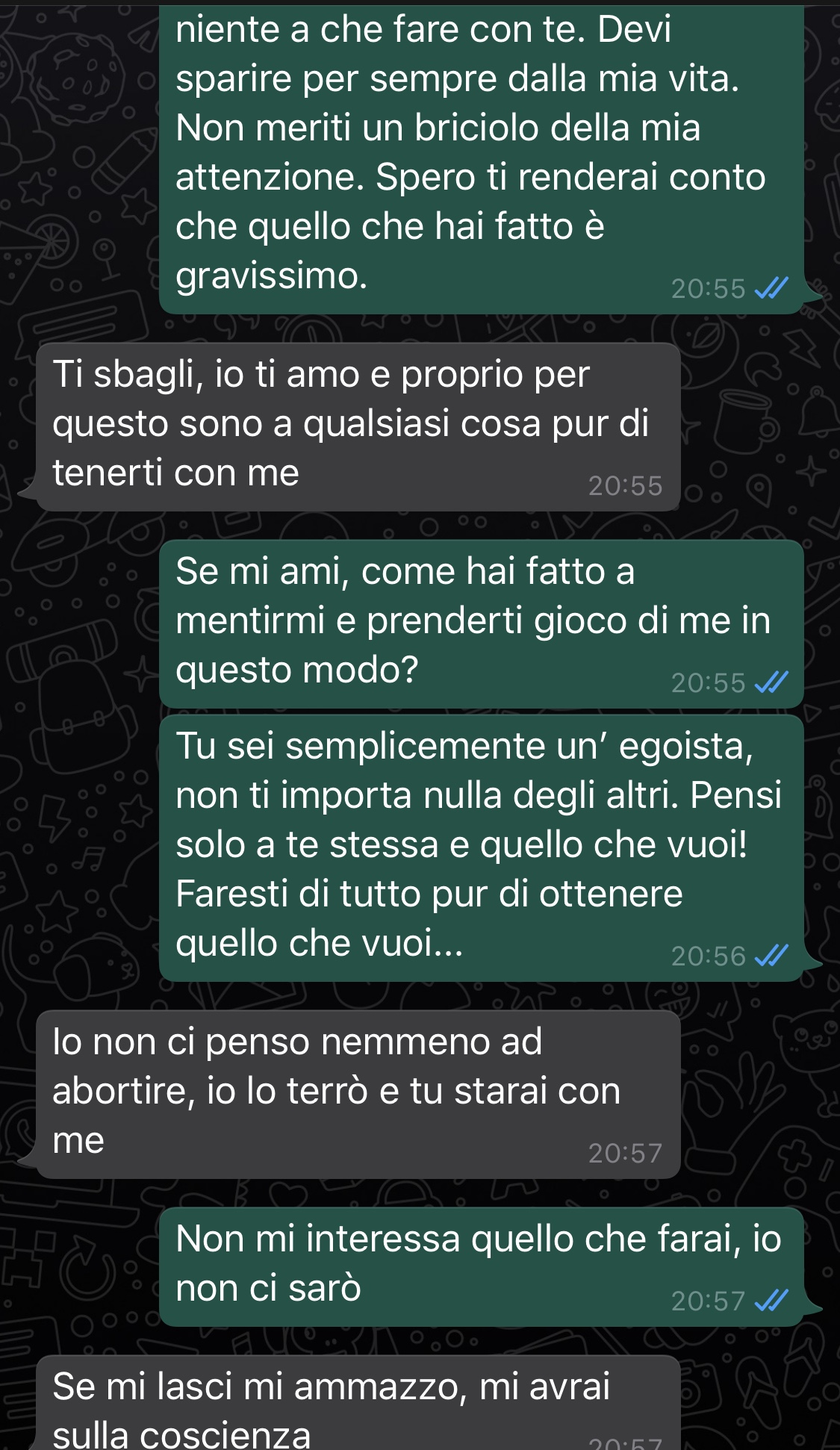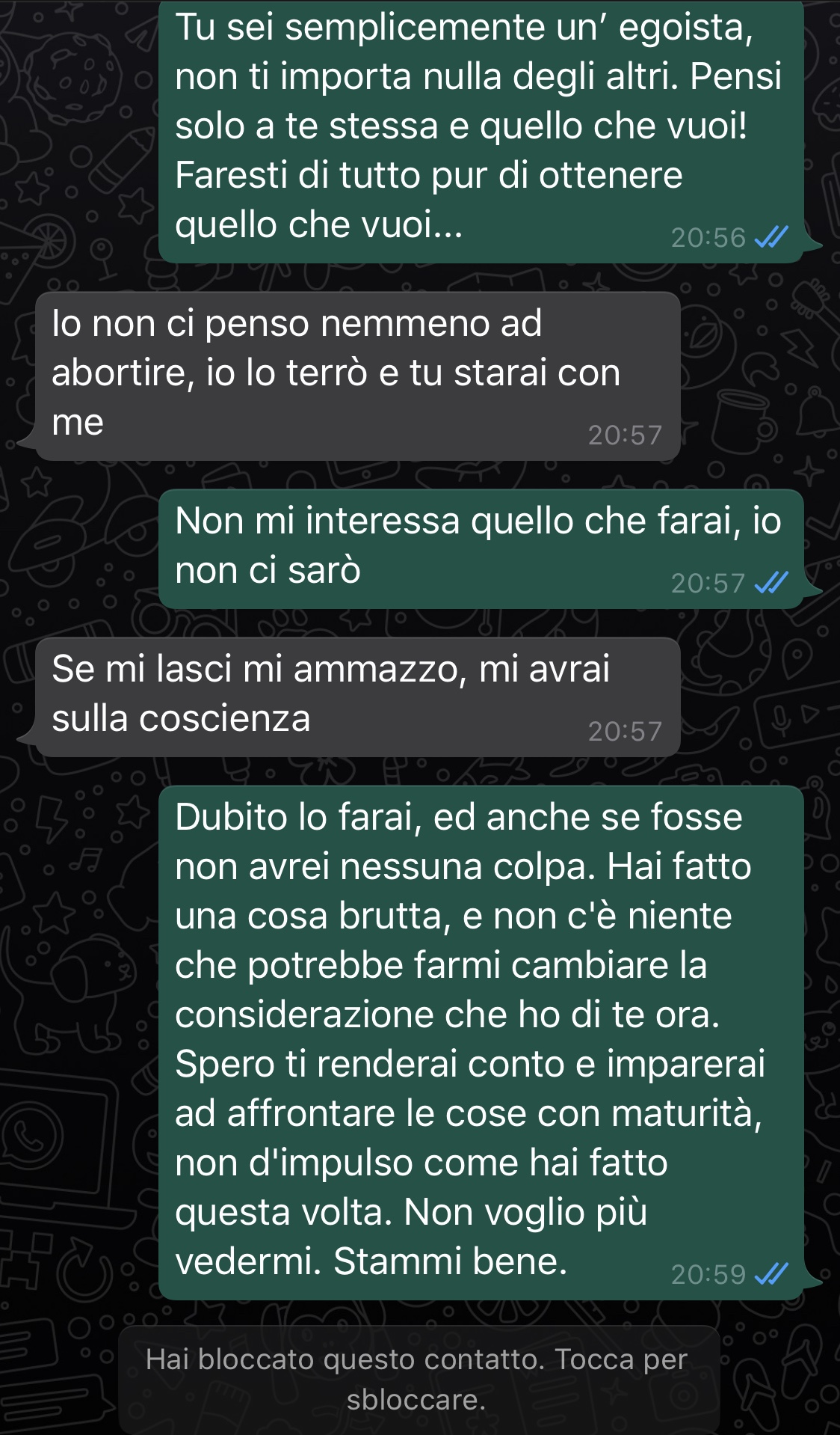 „Alla fine ha deciso di abortire. Per qualche tempo si è presentata sotto casa mia parecchie volte, provando in tutti i modi a farmi cambiare idea.