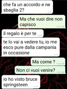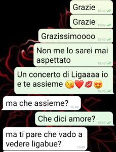 No amici miei di spunte blu, questa no. Mai e poi mai. Tutto potevo immaginare ma una cosa così… Pensate solo che all’inizio mi stava venendo un infarto dalla felicità. Il mio fidanzato che mi regala il concerto di Ligabue. Io che sono una fan sfegatata. Ma il colpo al cuore non è tanto per me quanto per lui. Infatti è uno tutto fissato col vecchio rock, suona la chitarra, i grandi miti del passato e menate varie. Quindi che meraviglia che andiamo a vedere Ligabue. Per lui è un sacrificio e quasi mi commuovo. E invece…. E invece il ca**o!!! Non ci viene lui. E se questo non è già abbastanza ora arriva la botta: vuole che ci vado con sua madre!! Ma dove si è mai sentito al concerto con la suocera?? Per me è inconcepibile. E pensate che sia finita? Seee magari. Arriva pure la ghigliottinata finale, quella da far cadere le braccia. Sono nera e non so come fargliela pagare. Idee?”