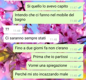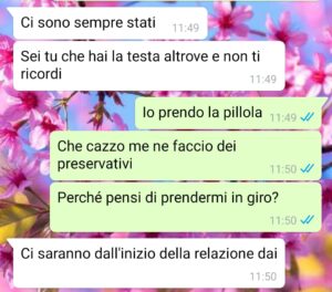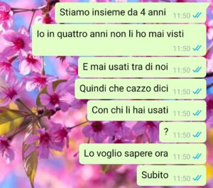 Io ho dato davvero tanto in questa relazione, ci ho messo tanto impegno e amore, ma evidentemente non è bastato. La cosa incredibile è che lui stava negando l’evidenza, cercando di trovare delle scuse al suo comportamento. Ora leggendo quella conversazione mi fa davvero pena, però vi assicuro che in quel momento il mondo mi è crollato addosso. Non vedevo una via di uscita, e tutto mi sembrava perduto.