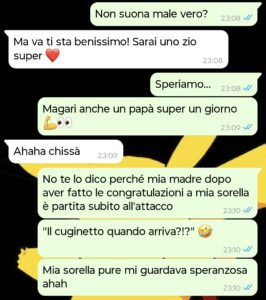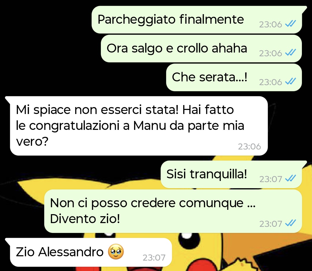 Venerdì sera sono andato come sempre a cena dai miei. Di solito io e Ludovica, la mia ragazza, ci andiamo insieme, ma questa volta ero solo perché lei aveva un impegno. Succede che durante la cena mia sorella annuncia alla famiglia di essere incinta e ovviamente passiamo la serata a festeggiare la splendida notizia! Io e mia sorella siamo molto legati, perciò dire che mi sono emozionato è davvero riduttivo. Nel durante scrivo subito a Ludo e anche lei è molto contenta di diventare zia.