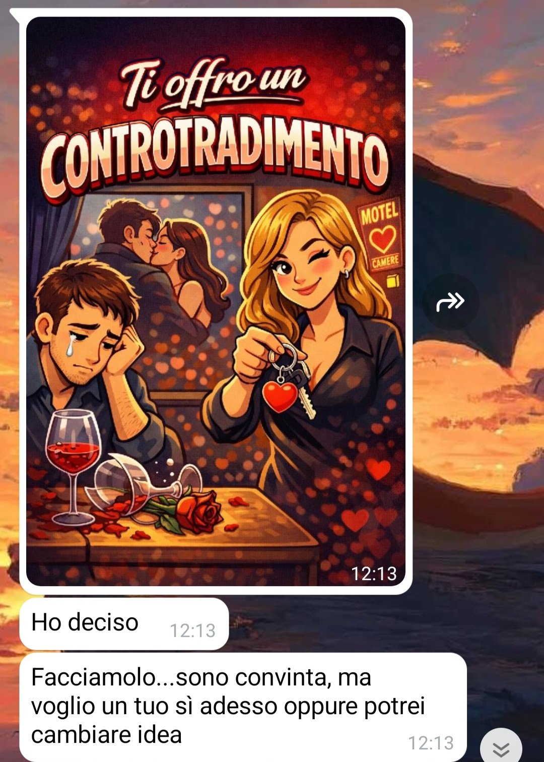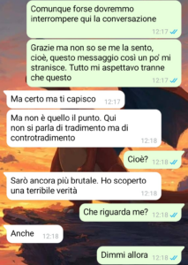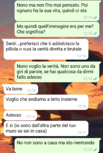 “La mia storia ha dell’incredibile, ma visto che, in un certo senso, ormai si è conclusa, e visto, da altri punti di vista, nel bene e nel male, è estremamente interessante, ho deciso di pubblicarla qui oggi. La mia vita è abbastanza monotona. Il mio lavoro è normale, la vita sentimentale, se così si può chiamare, è normale, il mio appartamento…indovinate un po’…è normale. Ho la passione per le cose nerd, sono patito di Action Figure, di carte collezionabili, ho i miei hobby che mi tengono compagnia. Ma l’altro giorno è successa una cosa che mi ha cambiato la vita. Da non molto vivo in questo appartamento e sullo stesso pianerottolo ci vive anche questa donna, Katia, un po’ più grande di me, con il marito, di cui non ricordo il nome. Con lui qualche volta ho parlato, con lei no. Io la noto sempre, perché è davvero una bella donna, ma lei no. In realtà, pensavo sinceramente che lei non sapesse nemmeno della mia esistenza dato che le poche volte che mi ha visto sulle scale non mi ha neanche salutato. Ma l’altro giorno mi è arrivato un suo messaggio sul mio numero privato, un messaggio che mi ha sconvolto.”