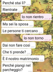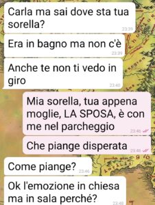 “Pagina di spunte blu buongiorno a tutti, io sono Carla e sono la sorella di Vanessa. Lei si è sposata con Damiano due sere fa. Ma il ricevimento non è andato come si aspettava lei. Infatti a un certo punto oltre a vederla arrabbiata noto che scappa verso il parcheggio. La seguo e la consolo, almeno ci provo. Ma ha ragione su tutto, non posso darle torto, e non perché è mia sorella. Io una cosa del genere non l’avevo mai vista, a nessun evento, e ho 37 anni (e ho fatto la cameriera in una sala ricevimenti per 15 anni…). E niente, sto lì a consolarla quando mi scrive Damiano, che cerca la sua dolce sposina. Giusto due messaggi ho scritto io prima che Vanessa mi strappasse il telefono di mano. E si “chiarisse” con l’amato. Vi allego gli screen della conversazione. Ci trovate tutto, o quasi, di quello che è successo. Che altro dire? Convivete pure ma non vi sposate! O fatelo senza parenti.”