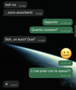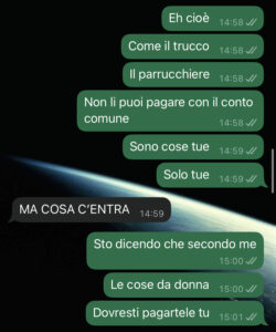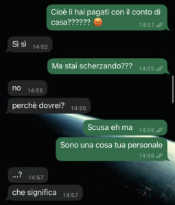 Quello che è successo qualche giorno fa mi ha fatto decisamente dubitare della sua buona fede. Abbiamo un conto personale a testa e un conto comune per le spese di casa: spesa, bollette e cose simili. La spesa di solito la fa lei ma ultimamente ho notato un certo squilibrio. Gliel’ho detto e lei anziché spiegarmi le sue azioni è passata sulla difensiva…boh…
