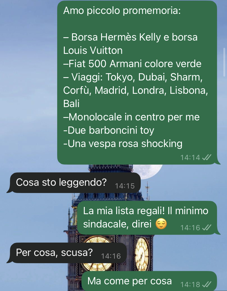 Ma la sua reazione alla lista mi ha lasciata sotto shock. Vi faccio leggere…