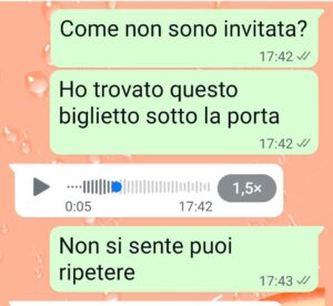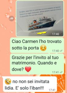 Ora lei si sposa e mi ha lasciato sotto la porta di casa una busta. Non ha avuto neanche la carineria di suonare e darmi la busta di persona. Comunque sotto la porta ho trovato una busta. Non c’era scritto niente fuori, ma dentro c’era sto biglietto per contribuire a un sogno, quello di una crociera. Sotto c’era intestatario (lei) e iban. Le ho subito scritto pensando che fosse un invito.