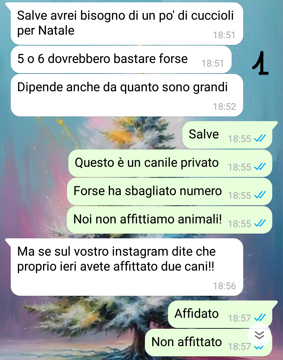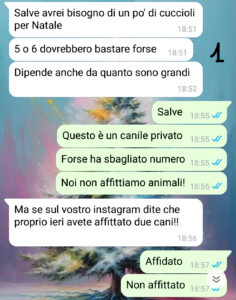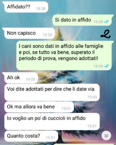 Certo magari proprio per sempre una casa non siamo disposti a dargliela – un cane va portato fuori mille volte al giorno.. e poi sporca.. e poi mangia.. e poi quando vuoi viaggiare come fai?!?! – ma ad esempio.. per una settimana si può anche fare.. o no!? E poi siamo o non siamo a Natale?!”