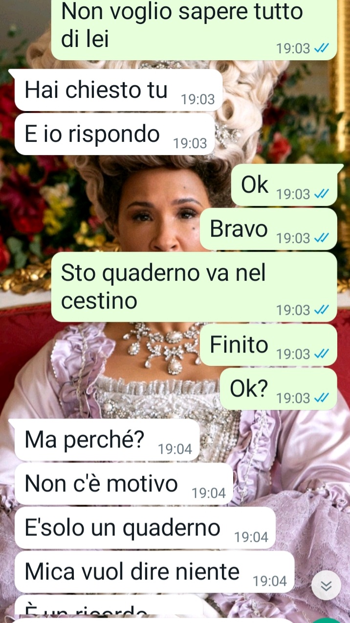 Io sono diventata verde. Cioè si tratta di una cosa estramemente intima, una quaderno molto intimo, molto da coppietta felice, che hanno condiviso insieme. Mi sento super gelosa perché io con lui non ho condiviso tutto questo. Loro hanno condiviso un sacco di cose insieme: viaggi, amici, parenti. Leu le ha regalato tantissime cose, anche costose, me lo ha detto lui. A me non ha regalato nulla di costoso.