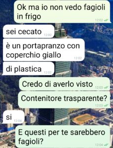 Per un problema con delle autorizzazioni devo lasciare il cantiere alle 11, quindi praticamente libero tutto il giorno. Avverto Giulia e vado a casa ad aspettarla per pranzo, che lei finisce alle 13. Ma non trovo i fagioli congelati che dovrebbero essere il nostro pranzo, come mi ha riferito poco prima. Senza alcuna velleità chiedo lumi e…succede tutto questo. Normale non è e non ci sono nemmeno motivi validi.”