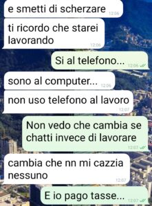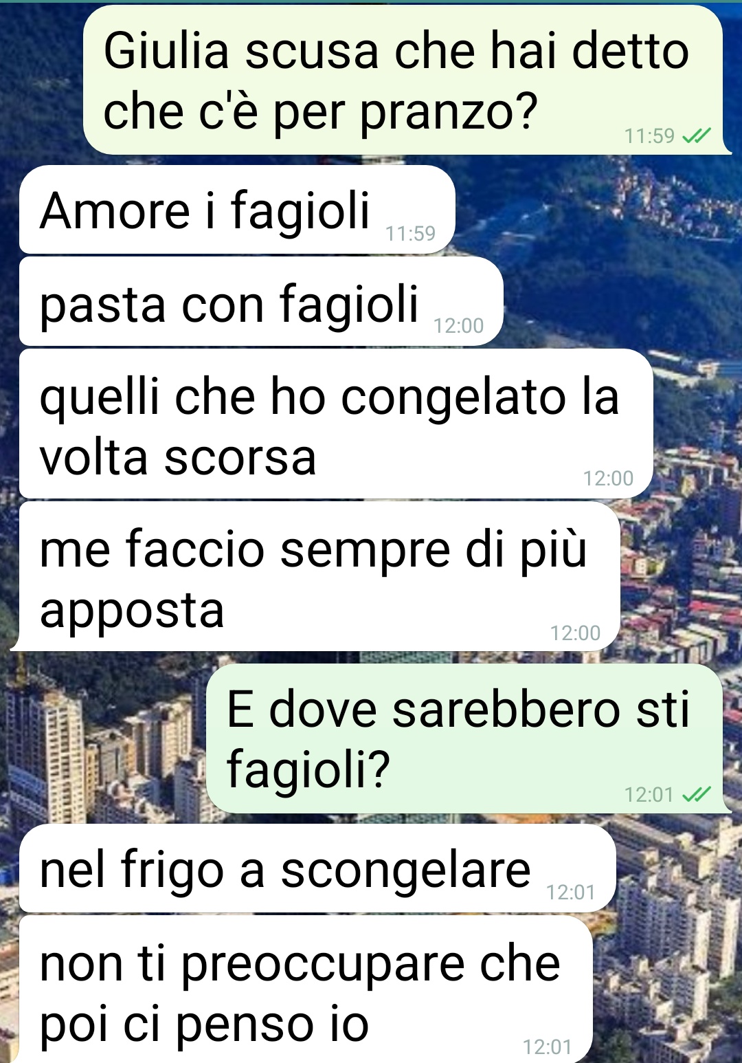 Per un problema con delle autorizzazioni devo lasciare il cantiere alle 11, quindi praticamente libero tutto il giorno. Avverto Giulia e vado a casa ad aspettarla per pranzo, che lei finisce alle 13. Ma non trovo i fagioli congelati che dovrebbero essere il nostro pranzo, come mi ha riferito poco prima. Senza alcuna velleità chiedo lumi e…succede tutto questo. Normale non è e non ci sono nemmeno motivi validi.”