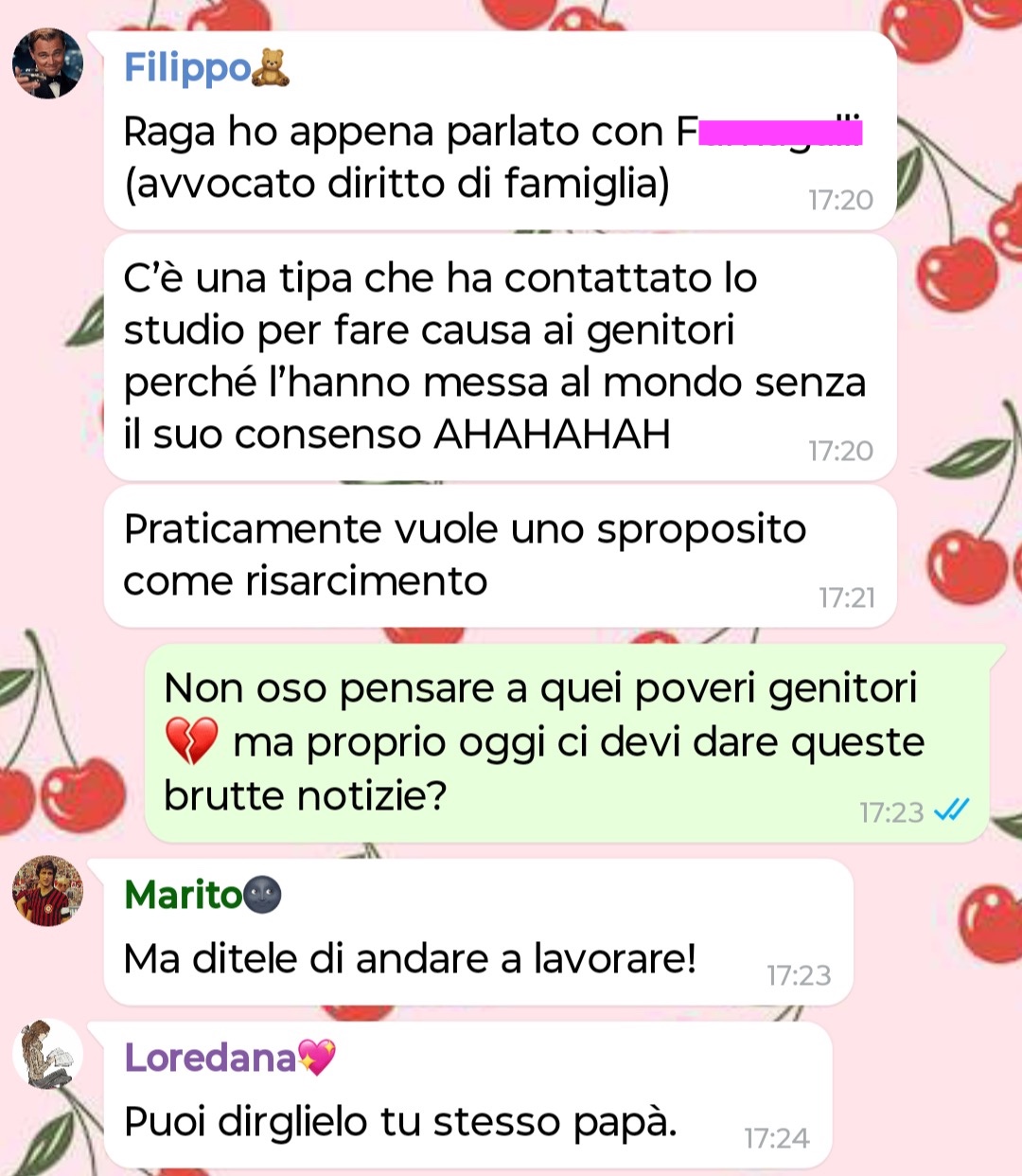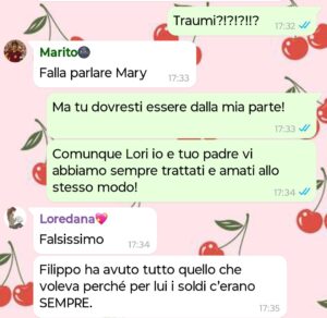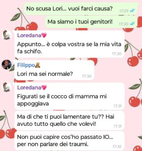 Il colpo di grazia però me l’ha dato il messaggio che ha scritto Filippo sulla chat di famiglia… e la risposta di Loredana: vuole farci causa perché non ha chiesto lei di nascere e non è per niente contenta di come è andata la sua vita.