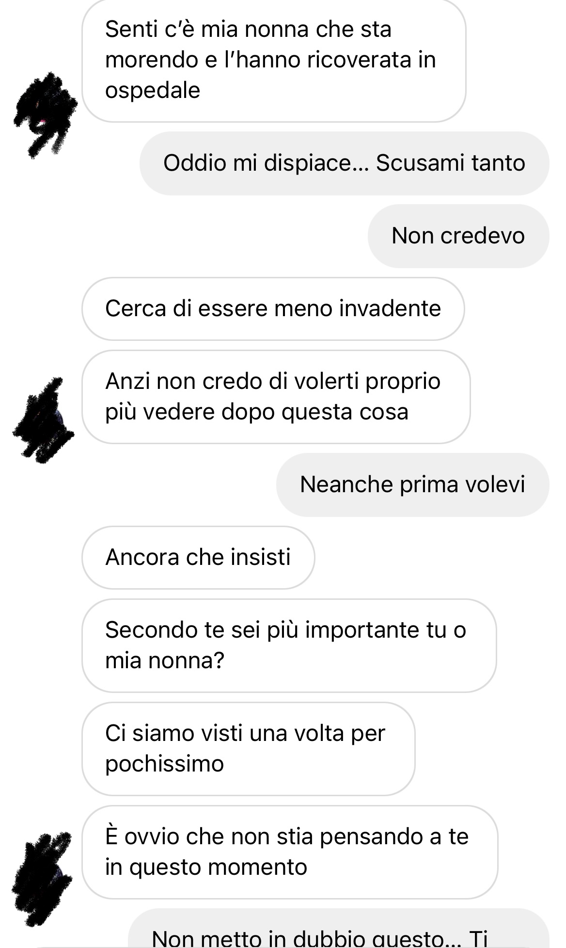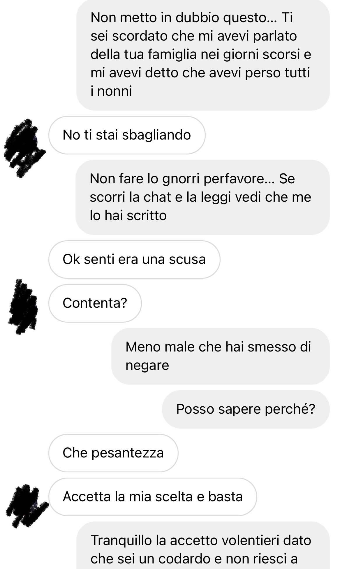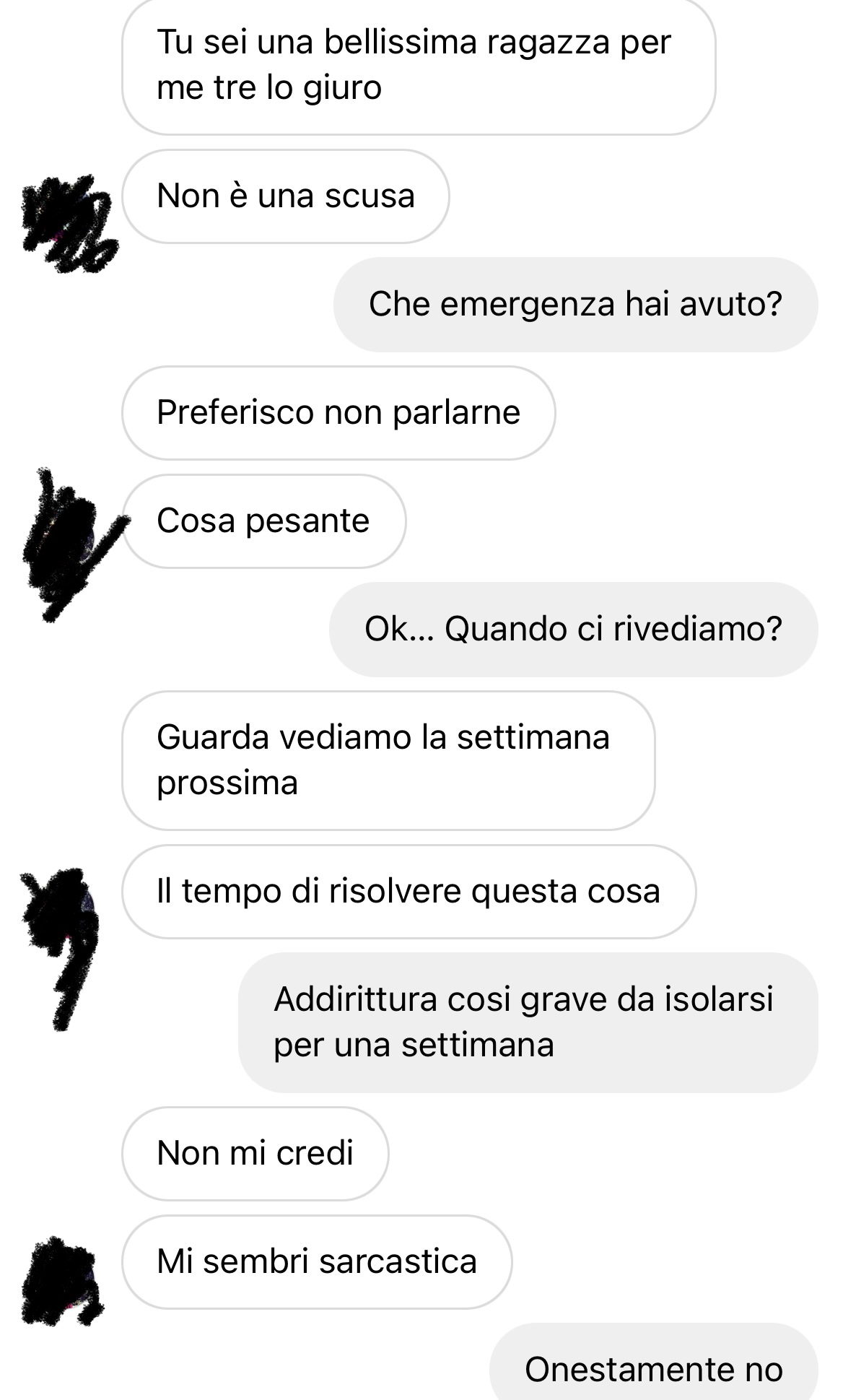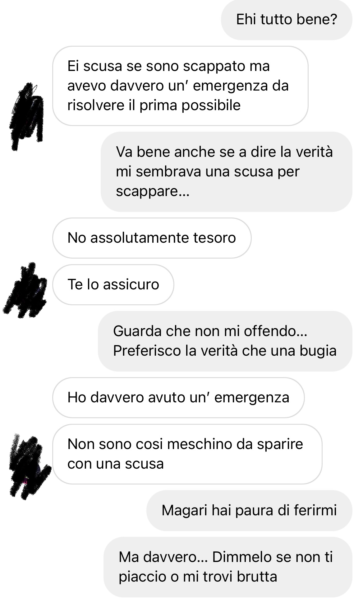 La conversazione avviene la settimana scorsa con un ragazzo che ho conosciuto sul web e che dovevo incontrare dal vivo per la primissima volta. Mi aveva riempita di complimenti, frasi melense nei giorni precedenti e mi ci trovavo bene a parlare via messaggio, quindi avevo pensato finalmente di aver trovato qualcuno di interessante.