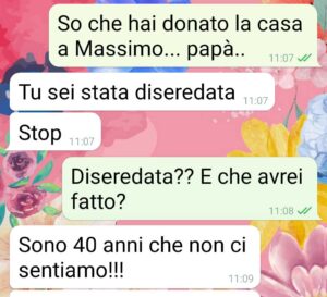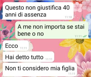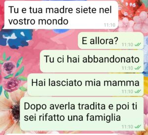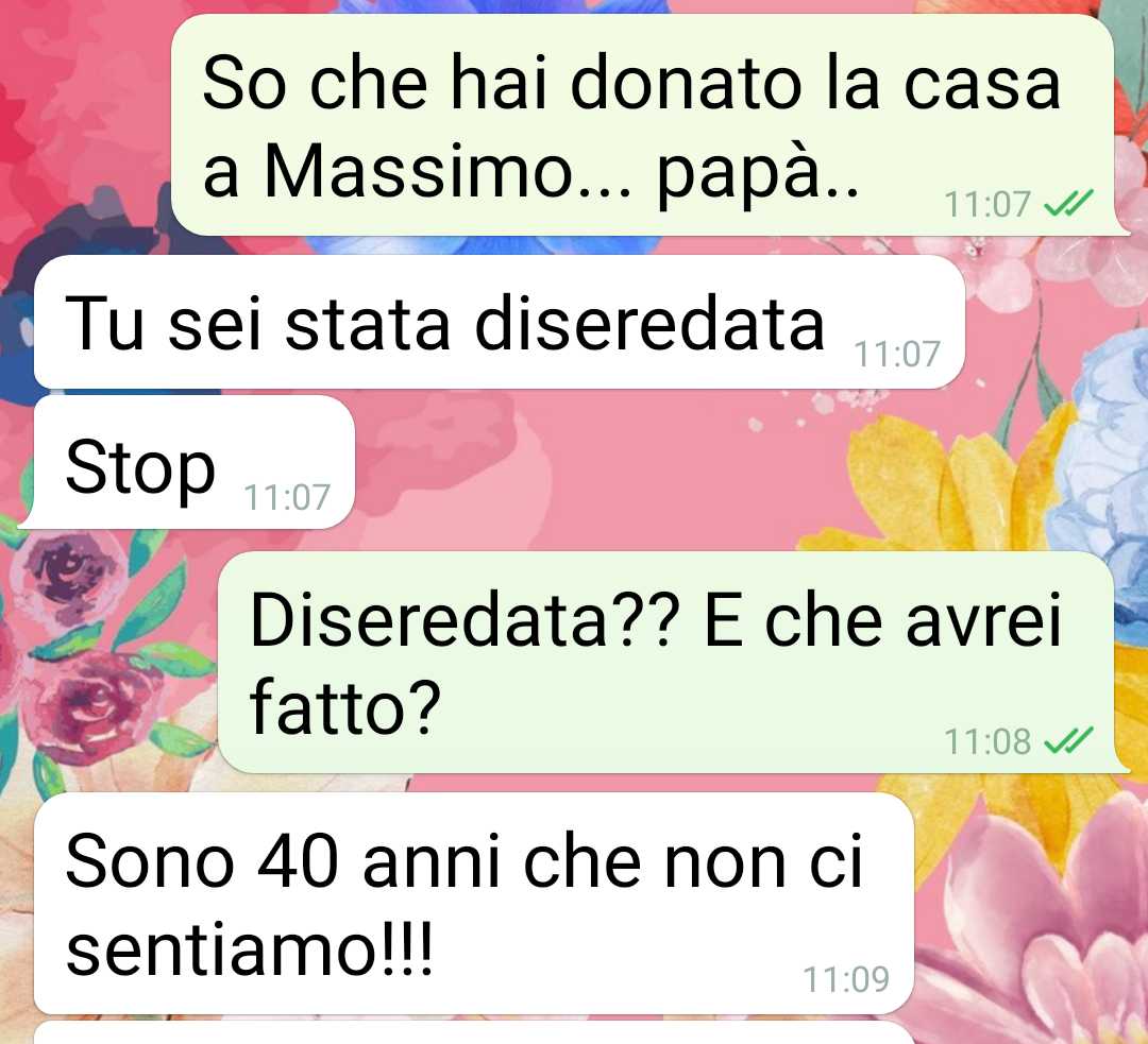 Sono la figlia del primo matrimonio di mio “padre”. Poi mio padre si è sposato in seconde nozze e ha avuto un altro figlio. Ho scoperto tramite un’amicizia che sto essere ha lasciato la sua casa in donazione al mio fratellastro, che non ho mai visto. Sono riuscita ad avere il suo numero di cellulare dal suo panificio sotto casa, con una scusa. Mi sono infuriata perché mi è sembrata l’ennesima beffa dopo una vita di privazioni, in cui sono cresciuta senza un padre presente anche se quel padre non era morto o impossibilitato a prendersi cura di me, ma semplicemente non voleva, non gli interessava risolvere con una figlia che evidentemente lo odiava. Si è solo lasciato scivolare addosso tutto e si è rifatto una vita.