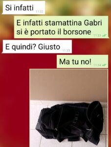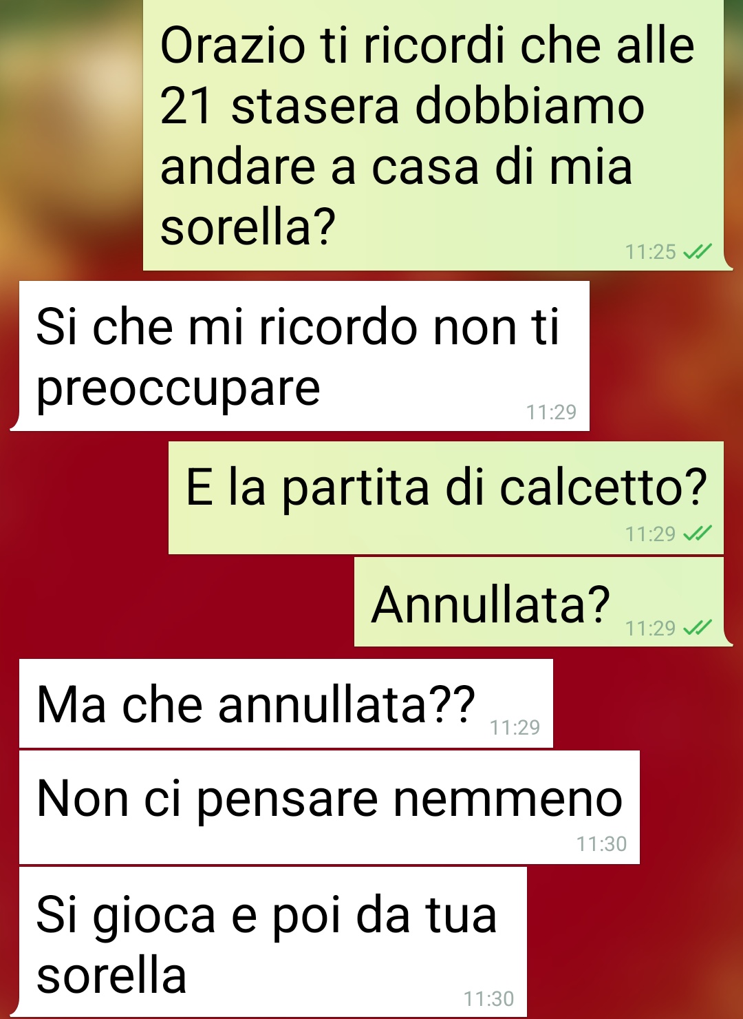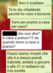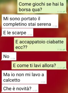 “Mio marito da qualche tempo non si lava più al campo di calcetto, come ha sempre fatto da quando lo conosco. E parliamo di 23 anni di relazione. È sempre stato un patito più che un appassionato, giocherebbe anche a natale se capita di venerdì. E ha trasmesso la stessa passione a nostro figlio, che da qualche mese ha compiuto 16 anni, ed è quindi stato ammesso al club dei grandi. È abbastanza strutturato da fare a sportellate con i 40/50 enni. Sta cosa che adesso torna a farsi la doccia a casa non è che mi interessi, ma l’altra sera avevamo una serata da mia sorella, la cui casa dista 10 minuti dal campo di gioco. E visto gli orari stretti, perché figurati se rinuncia alla partita, per me è ovvio che la doccia la facessero al campo, padre e figlio. Ma mi accorgo che Gabriele è uscito in mattinata col borsone ma Orazio no. Perché? Non giocano più? O faranno tardi per tornare a casa? Questo è il risultato del confronto con mio marito. Sono una brutta persona se condivido questi screen?”