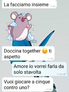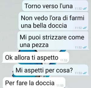 La mia attuale ragazza niente la doccia si fa insieme. Tipo momento sacro. Tipo che se te la fai da solo sei un porco pervertito onanista e sociopatico. Vi allego gli screen in questo messaggio e spero che mi pubblichiate almeno per vedere la gente cosa ne pensa e se qualche povero cristo ha una tipa come la mia.”