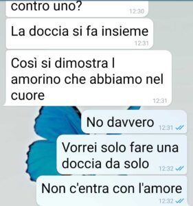 La mia attuale ragazza niente la doccia si fa insieme. Tipo momento sacro. Tipo che se te la fai da solo sei un porco pervertito onanista e sociopatico. Vi allego gli screen in questo messaggio e spero che mi pubblichiate almeno per vedere la gente cosa ne pensa e se qualche povero cristo ha una tipa come la mia.”