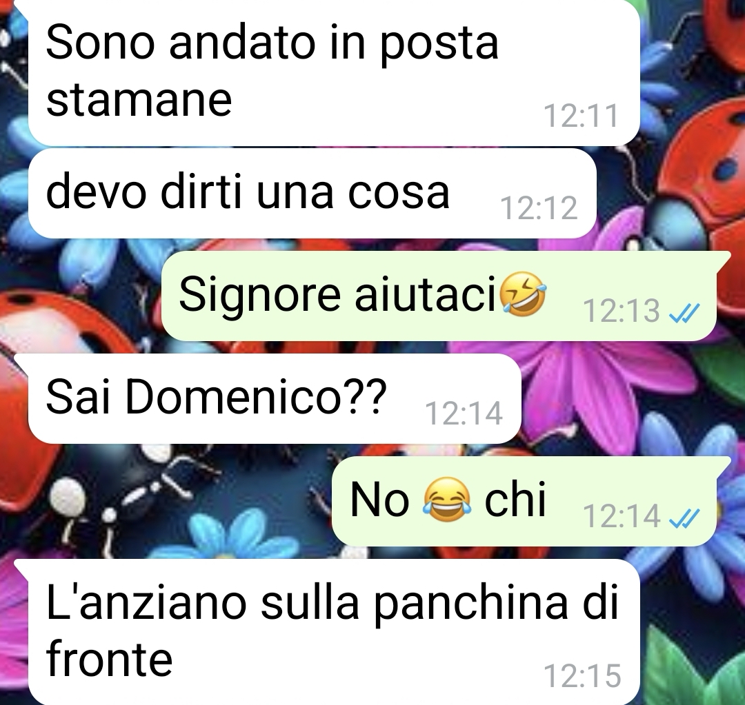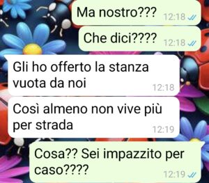 Il tutto nasce una mattina in cui Gianni deve recarsi alle poste della loro cittadina, un luogo che frequenta spesso a quanto abbiamo capito, e si incontra con questo signore di nome Domenico. Si parlano, si confidano e così Gianni prende una decisione. Lo fa a cuore aperto, felice di poter dare una mano a chi ne ha bisogno. Ma Cinzia ne è all’oscuro, almeno all’inizio. Perché la chat inizia proprio quando Gianni le comunica la notizia. Avrà reagito bene o male? Cosa avrebbe potuto fare?