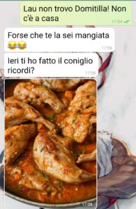 Ieri sera era l’ultima sera insieme, prima del suo andare via. Come “ultima cena”, ha voluto cucinarmi qualcosa. Un coniglio alla cacciatora. L’ha chiamato “un gesto di pace”. Buonissimo. Lo abbiamo mangiato insieme e io ho fatto pure il bis. Il giorno dopo però la mia gatta Domitilla non si trovava. L’ho cercata ovunque ma niente, scomparsa! Mi sono preoccupato.