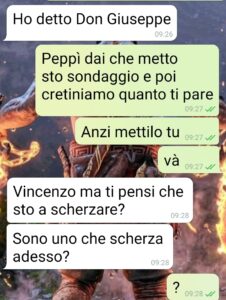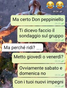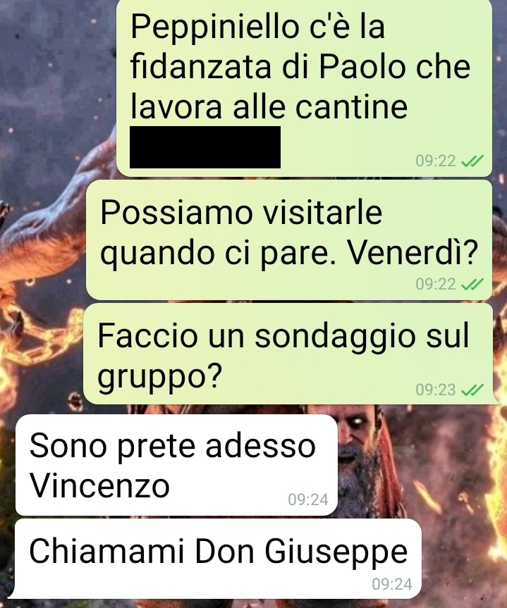 Un saluto poco festoso a tutti voi gente di spunte. Anzi un saluto mesto. Che ho poco da stare allegro dopo questa chat. Sono io che parlo a DON GIUSEPPE, un mio amico di vecchia data ( ci conosciamo dalle elementari) che alla soglia dei 40 anni è diventato prete. Ha ricevuto la chiamata, con stupore un po’ di tutti, passati i 30, e adesso ha pure una parrocchia co-assegnata (?). Poco male, anzi bene se questa è la sua vocazione. A me, come agli altri amici, interessa il giusto. Il nostro rapporto non cambierà di certo, cementato da tanti anni di avventure e complicità. Giusto alle discussioni da rozzi sulle conquiste femminili pensavo di dover rinunciare con lui. Più per decenza che altro. E invece… picchiata verticale. E con zero possibilità di risalire. Se qualcuno pensa che DON GIUSEPPE possa essere recuperato come uomo dal suo piedistallo…mi dica come. Per me è senza speranze.”