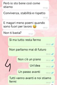 Oggi no. Oggi ho trovato la forza per scrivergli tutto. Per chiedere, senza mezzi termini, dove siamo diretti. La risposta non è stata quella che sognavo, ma è stata onesta. E a volte l’onestà è l’unica cosa che ti resta. Non ho chiuso la porta. Non ancora. Ma..”