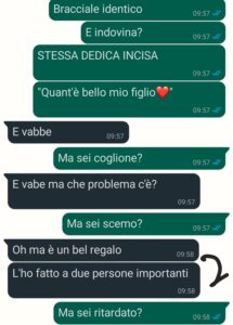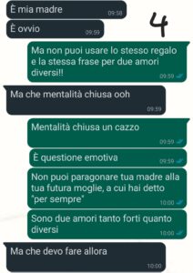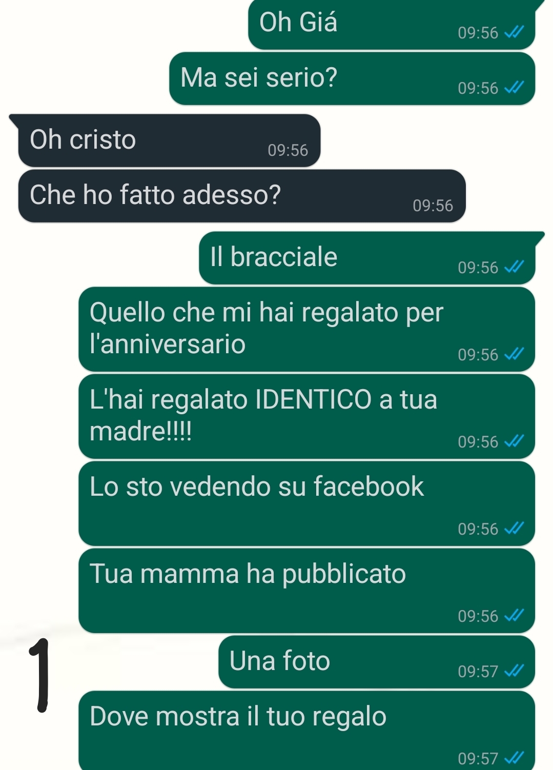 “Pensavo di aver ricevuto uno dei regali più belli di sempre. Per il nostro sesto anniversario, Giacomo mi ha regalato un bracciale stupendo, costoso, con inciso “Per sempre”. Mi sono anche emozionata, lo ammetto. Poi, qualche giorno dopo, scrollando Facebook, vedo una foto postata da sua madre… lo stesso identico bracciale. Stesso modello, stessa incisione, stessa confezione. All’inizio ho pensato fosse una coincidenza, o magari un’edizione limitata. Invece no: l’ha comprato apposta, doppio, “perché siete entrambe le donne più importanti della mia vita”. Con la stessa frase, lo stesso simbolo. Io non so se ridere, piangere o chiamare un terapeuta. Abbiamo discusso tanto, lui minimizza, dice che ama entrambe “seppur in modo diverso”, ma io resto con un dubbio enorme: è amore o è un attaccamento un po’ troppo… particolare?”