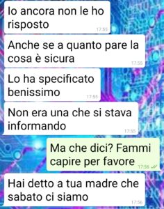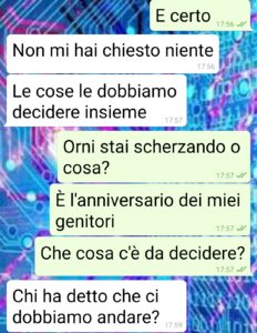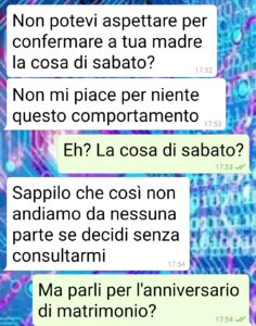 Ora io non so bene cosa aspettarmi dai commenti, redazione di spunte blu. Perché è chiaro che questo femminismo imperante ed estremo ormai è fuori controllo. Siamo passati da un opposto all’altro. E quindi non mi stupirei di vedere gente che da ragione ad Ornella. Ma quello che sostiene è semplicemente fuori di testa. E, lo vedrete pure voi, ci butta in mezzo il patriarcato tanto per farsi ragione. Ma ha torto marcio! Dove si è mai detto che ogni cosa va discussa e decisa? Ci sono cose che vanno fatte e basta. Che diavolo vuoi consultarti con il fidanzato/compagno/marito ecc se i tuoi fanno 30 anni di matrimonio? E fanno la messa in chiesa nel pomeriggio e la cena poi? Con 30 invitati? Sentiamo dai. Qualcuno esiste (che non sta in Australia) che dice alla madre: “ok mamma, controllo l’agenda. Se è libera vediamo che ne pensa *nome fidanzata* e ti faccio sapere se partecipiamo”. Pazzia allo stato puro”