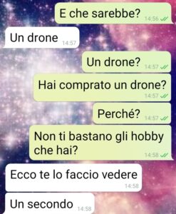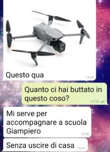 Io non so signori di spunte, sono sconcertata. Vi mando questi screen forse per avere conforto e sostegno. O per capire se devo dare più importanza a questa follia di mio marito. Non vorrei sottovalutare la cosa e poi pentirmene col tempo. Perché ok che si dice che per un paio di minuti al giorno il nostro cervello parte per la tangente, ma qua è convinto e da settimane a quanto pare. Abbiamo un figlio che va alle elementari, e ad accompagnarlo a scuola ci pensa lui, che lavora da casa, mentre io no, esco presto la mattina. Capisco che sia fastidioso ogni giorno praticamente un’ora e mezza per portarlo riprenderlo. E a piedi, che con l’auto ci vuole pure di più, con il traffico. Ma usare un drone per seguirlo da casa? Ma che boiata è? E a parte tutte quelle che ha scritto, di boiate, ma come cavolo si fa solo anche a partorirla una simile idea? Per voi sta bene con la testa?”