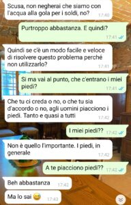 “Sono stata accusata di essere bigotta, chiusa di mentalità, e anche cose peggiori. Ma scherziamo? Ma dove siamo finiti in questo 2025? Se una persona ha un minimo di pudore, di decenza e di buon gusto, allora è una bigotta? Io non ci sto. Questa è una mentalità tossica e non ne voglio fare parte. Ognuno è libero di fare ciò che vuole ma io devo avere il diritto di dire no, almeno per quanto mi riguarda. Stavo con Tommaso, Tommy, già da anni e, non perché mancasse l’amore, dopo mille dubbi avevamo deciso di sposarci. I mille dubbi, appunto, non erano sulla coppia ma sui costi che purtroppo un matrimonio porta con sé. Anche facendo le cose più umili, è difficile andare sotto certe cifre, soprattutto se si vuole invitare un po’ di amici e parenti. Tommy, inoltre, non aveva nessun’intenzione di fare un matrimonio “povero” e questo ha portato a molte litigate. Dovevamo capire come organizzare questa cerimonia e soprattutto come pagarla. Non avevamo idee concrete fino a quando, un giorno, lui mi manda questo messaggio con allegata la foto di un mio piede fatta quest’estate.”