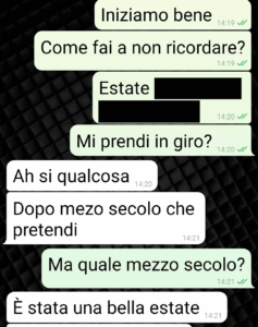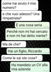 Giovanni scopre che Riccardo, un 25enne,  gli somiglia in maniera incredibile e parlando con lui arriva alla conclusione che sono padre e figlio. Riprendete la parte 1 per i dettagli se non avete letto. Ottiene quindi il numero della madre del ragazzo, Rosaria appunto, con cui ha avuto un flirt in gioventù. Ed è da qui che inizia questa seconda chat, che il nostro inizia subito dopo aver chiuso quella con Riccardo.
