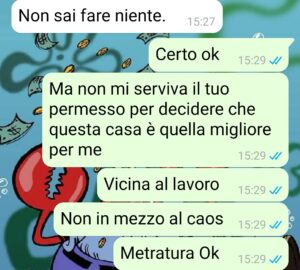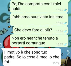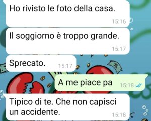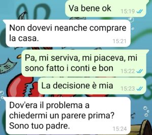 È anche per questo che ho deciso di comprare casa, per avere finalmente uno spazio mio, silenzioso, dove nessuno potesse dirmi come vivere. Pensavo che bastasse, ma mi sbagliavo, perché mio padre non ha mai accettato l’idea che io potessi avere una vita separata dalla sua volontà. Non ha mai smesso di farmi sentire la sua voce, il suo controllo, la sua presenza pesante. Questa chat è solo uno dei tanti momenti in cui ha tentato, ancora una volta, di mettere le mani sulla mia vita. E stavolta io non ce l’ho fatta a restare zitto. Mattia.”