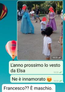 Sono la mamma di Francesco, uno splendido bambino pieno di gioia e di interessi. Eravamo al parco e c’erano Elsa e Anna di Frozen. Francesco va pazzo per Elsa. Io lo vedo come cerca di cantare la canzone Let it go. Ripete le movenze, è bravissimo a imitarla. Lui è felice così. Appena ha visto la ragazza vestita da Elsa gli si sono illuminati gli occhi. Era felicissimo, gioioso, con quegli occhi pieni di gioia che solo i bambini e le bambine riescono ad avere.