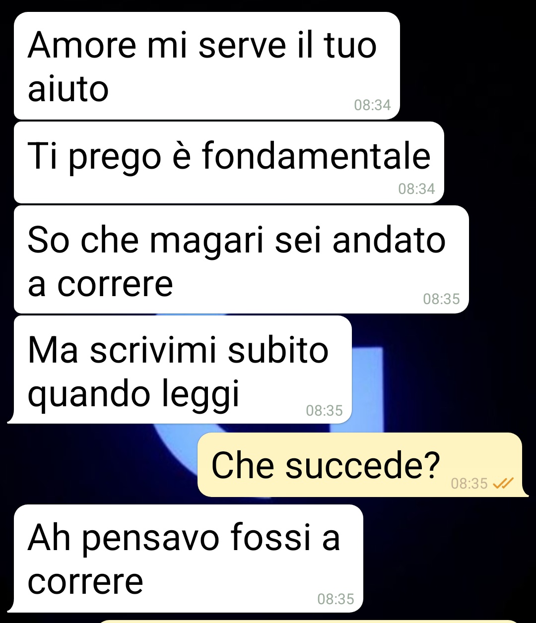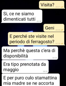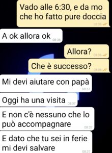 Ero al secondo giorno delle tante agognate ferie, ho finito la mia corsa mattutina e sono pronto sporcarmi le mani con una Guzzi d’epoca che voglio restaurare. Ma ecco l’emergenza. Suo padre deve essere accompagnato a una visita. Non lo faccio per lei? La lascio sola ad aspettare mezza giornata in sala d’aspetto? Peccato che ho capito male. Dice lei. Io dico che voleva inc****mi. Che dite voi?”