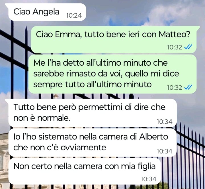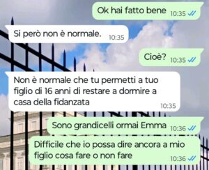 “Buongiorno Spunte Blu, mi chiamo Angela e sono mamma di un ragazzino di 16 anni. Saprete tutti bene come sono ormai i ragazzini dell’età di mio figlio immagino, vero? Insomma i 16 anni di oggi non sono certo i 16 anni dei miei tempi, i ragazzi oggi sono più spigliati e autonomi. Mio figlio è fidanzato con una ragazzina sua coetanea e ieri sera è capitato che lui mi ha detto che sarebbe rimasto a dormire a casa di questa ragazzina che logicamente vive con la sua famiglia. Io gli ho risposto va bene perché non ci ho visto proprio nulla di male, solo che stamattina mi scrive la mamma di questa ragazzina e inizia a dirmene di tutti i colori solo perché ieri ho permesso a mio figlio di restare a dormire a casa sua. Io mi chiedo in che mondo vivano certe persone nel 2026. Questa tizia pensa di poter chiudere sua figlia nella torre d’oro delle principesse di una volta e pensa ancora davvero che sua figlia e mio figlio non abbiano mai fatto niente di minimamente intimo. Secondo voi può mai essere possibile? Certo che no! Viviamo nell’era moderna cavolo però questa gran signora si ostina ancora ad insultare me.”