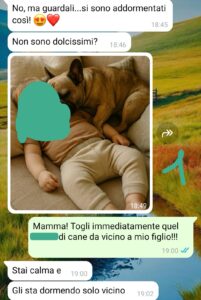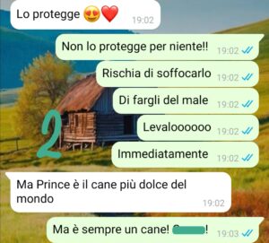 Quando è nato Enea la sua priorità è stata quella di far sì che il cane accettasse il bambino e un giorno è arrivata a metterlo nella cuccia del cane affinché Prince imparasse a riconoscerne l’odore.