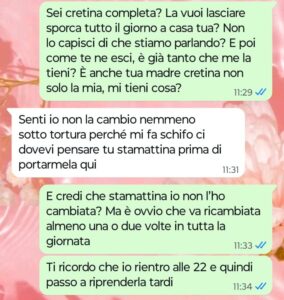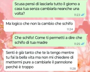 “Salve Spunte Blu, sono una donna di 45 anni che non ha più una vita propria. Purtroppo convivo con una madre affetta da demenza senile già da diversi anni e sono completamente sola a prendermi cura di lei. Sono sola non perché io sia figlia unica ma semplicemente perché mia sorella ha deciso di fregarsene altamente di nostra madre da quando lei appunto si è ammalata, peggiorando sempre di più di giorno in giorno. Aspettate di leggere come mi ha risposto in merito mia sorella oggi appena le ho ricordato di fare una cosa importantissima per nostra madre visto che io mi sono permessa una giornata risicata di vacanza, se così possiamo chiamarla. Ecco vi presento mia sorella con questa chat stupenda che vi giro qui”
