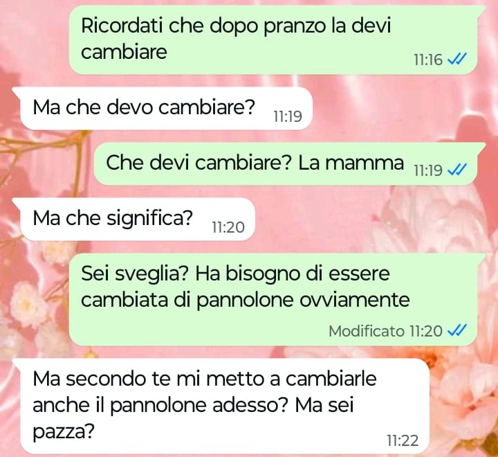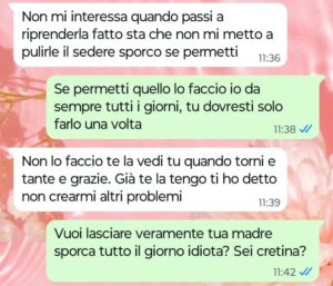 “Salve Spunte Blu, sono una donna di 45 anni che non ha più una vita propria. Purtroppo convivo con una madre affetta da demenza senile già da diversi anni e sono completamente sola a prendermi cura di lei. Sono sola non perché io sia figlia unica ma semplicemente perché mia sorella ha deciso di fregarsene altamente di nostra madre da quando lei appunto si è ammalata, peggiorando sempre di più di giorno in giorno. Aspettate di leggere come mi ha risposto in merito mia sorella oggi appena le ho ricordato di fare una cosa importantissima per nostra madre visto che io mi sono permessa una giornata risicata di vacanza, se così possiamo chiamarla. Ecco vi presento mia sorella con questa chat stupenda che vi giro qui”